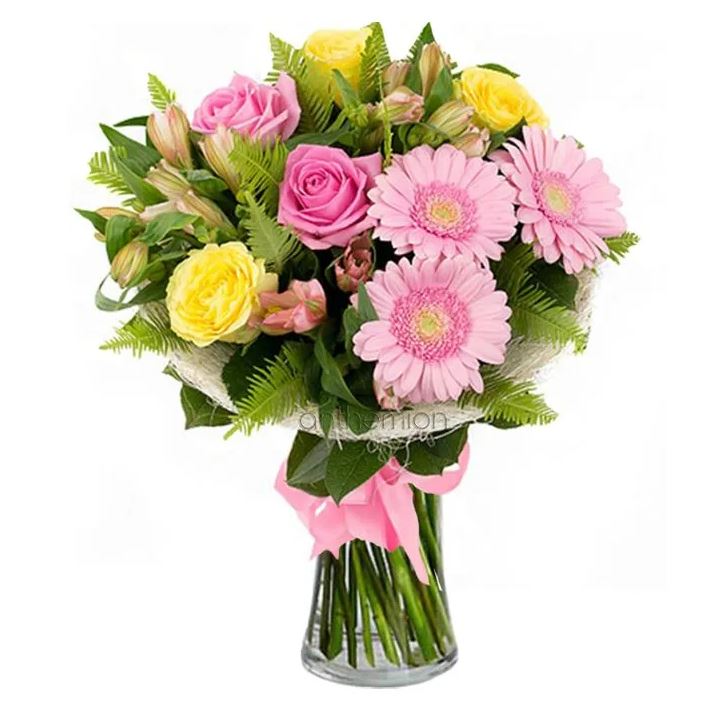 Επιλέξτε ένα κομψό μπουκέτο με ροζ και κίτρινα τριαντάφυλλα, ρομαντικές ροζ ζέρμπερες και αλστρομέρειες που περιτριγυρίζονται από υπέροχη πρασινάδα για να στολίσει το βάζο της και να χαμογελάει κάθε φορά που τα αντικρύζει.